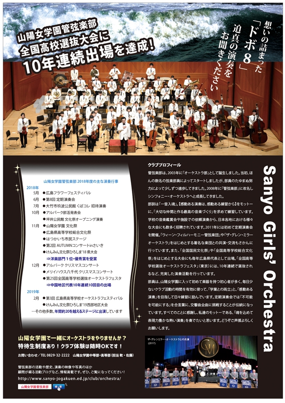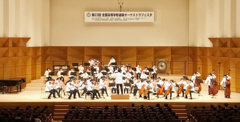 高校オーケストラの全国大会にあたる大会です。各地方から選抜されたオーケストラ部が集まり、それぞれの演奏を聴きあい評価しあいます。また、各校から選抜された人での合同演奏は、大会の名物。プロから指導をうけ、演奏を発表します。本校は連続で中国地区代表に選ばれています。