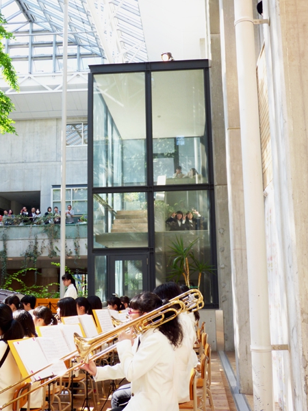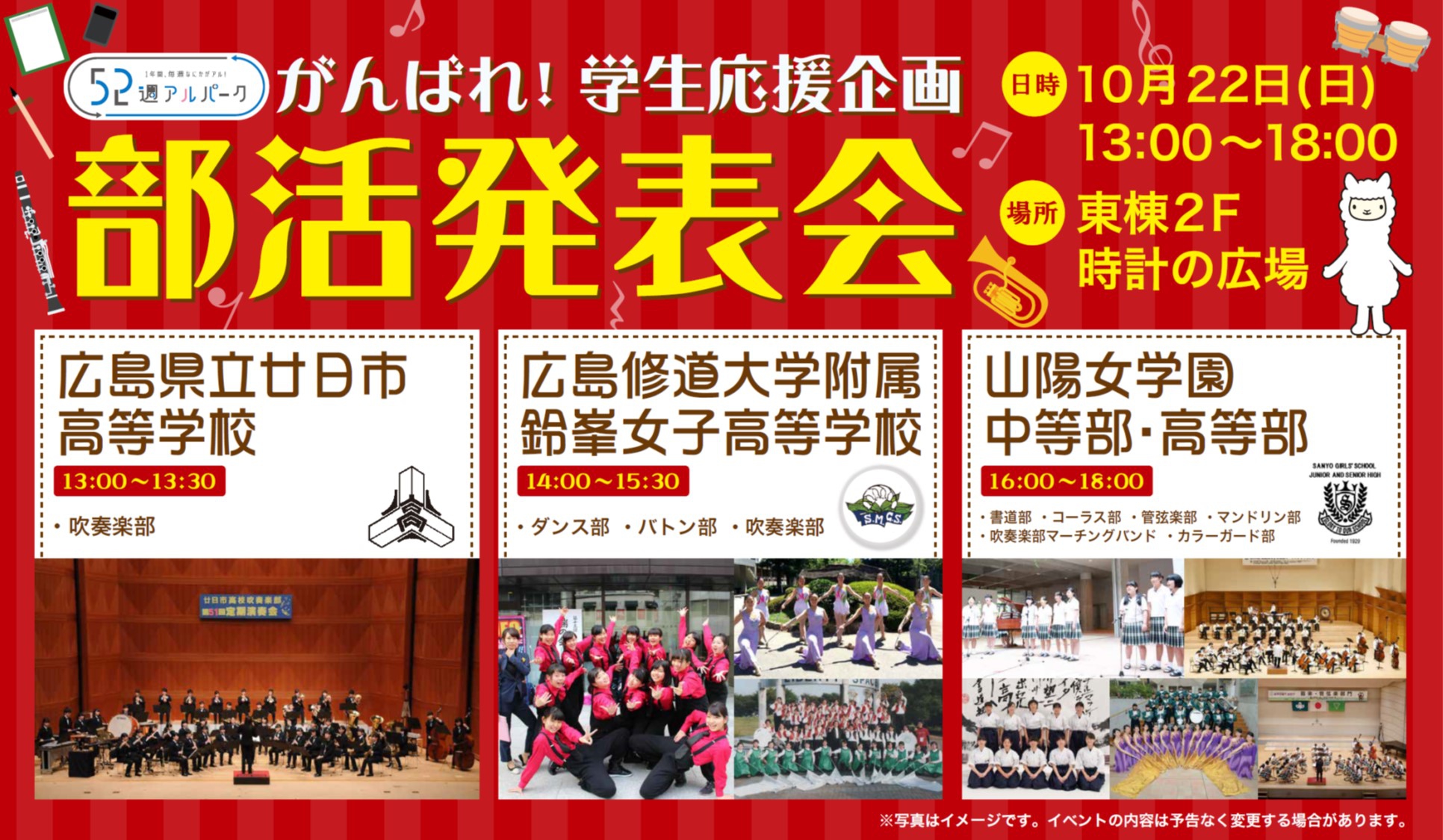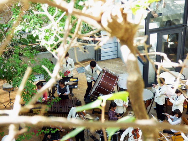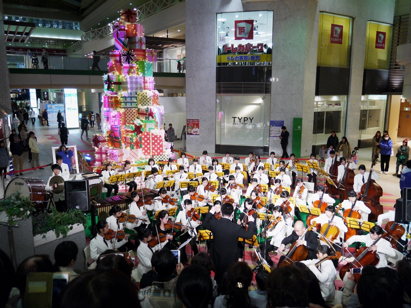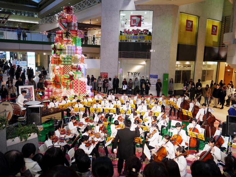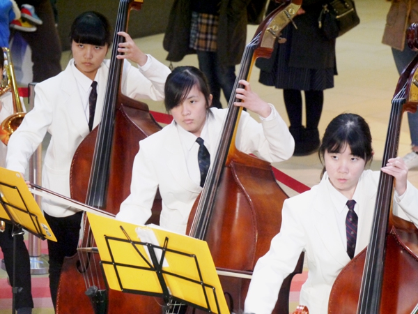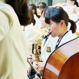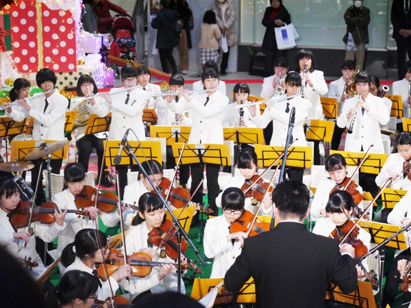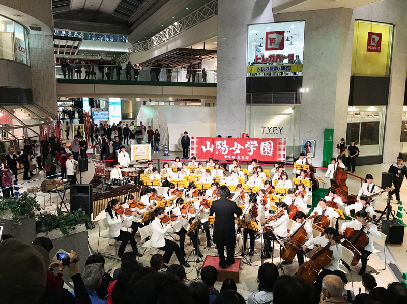 アルパーク東棟2階時計の広場にて、「がんばれ!学生応援企画 部活発表会」という催しが開催されました。参加したのは、県立廿日市高等学校、修大附属鈴峯女子高等学校、そして私たち山陽女学園中等部・高等部。山女からは6つのクラブが出演し、管弦楽部は大トリでした。台風が接近し天候がどんどん悪化していく中、多くの方々が私たちの演奏を最後まで聞いてくださいました。