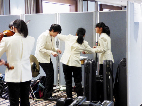 早朝に楽器積み込み、そして出発。昼には東大阪市市民ふれあいホールにて音出し。夕方、大会会場である奈良県橿原文化会館にてリハーサルを行いました。