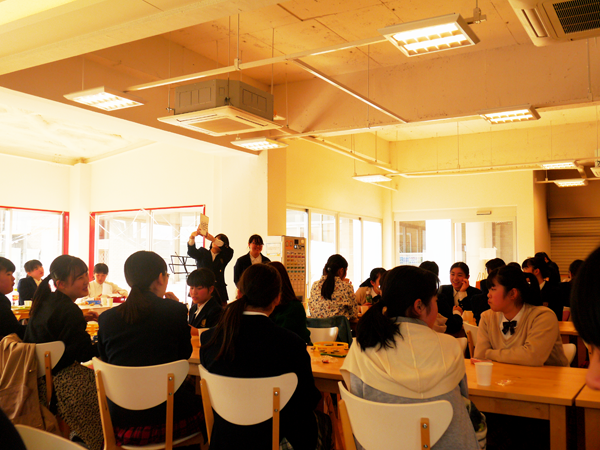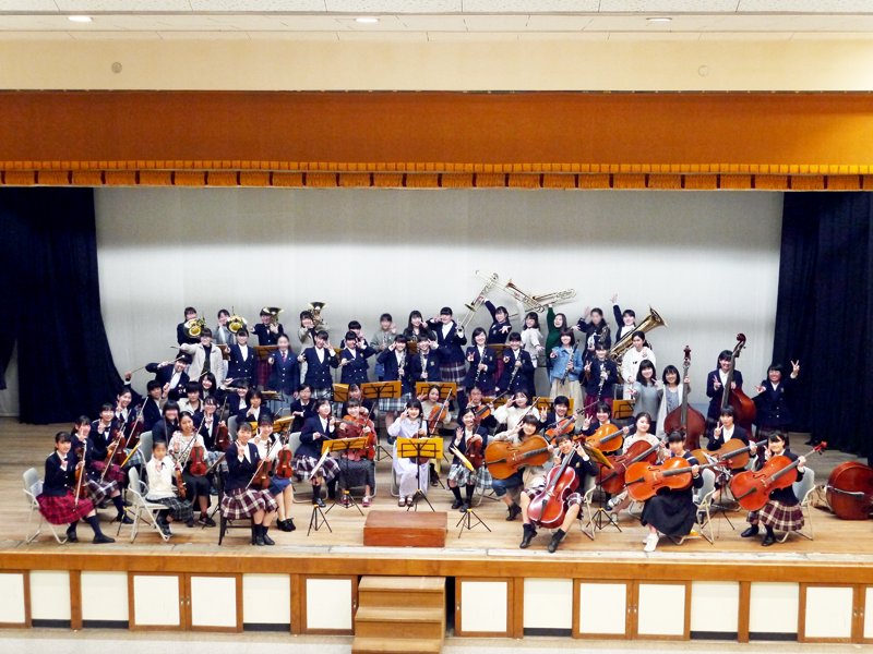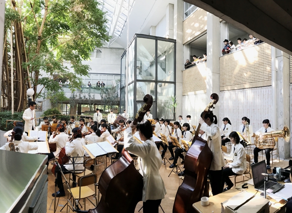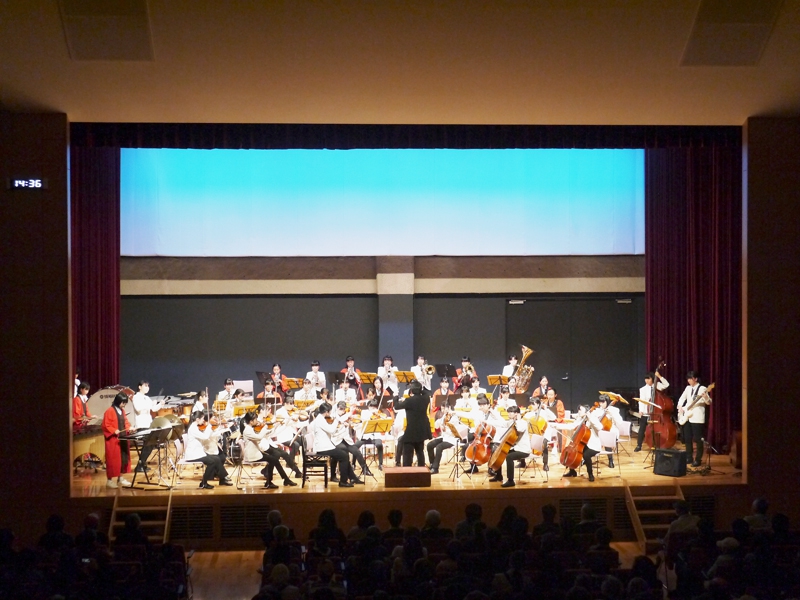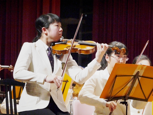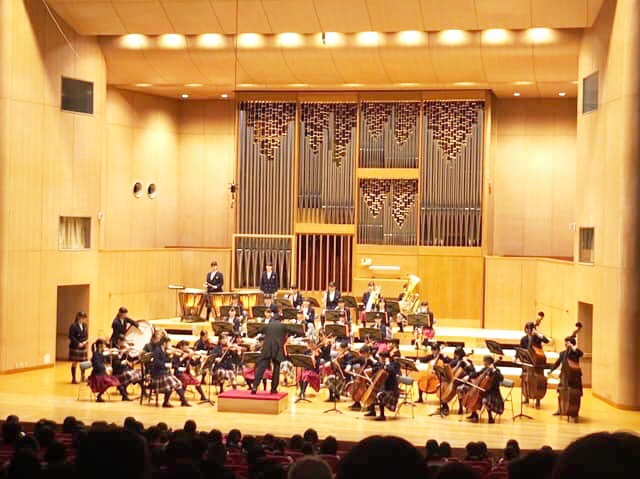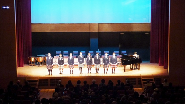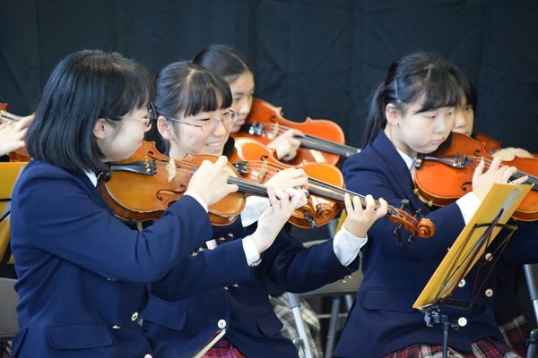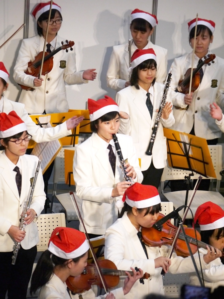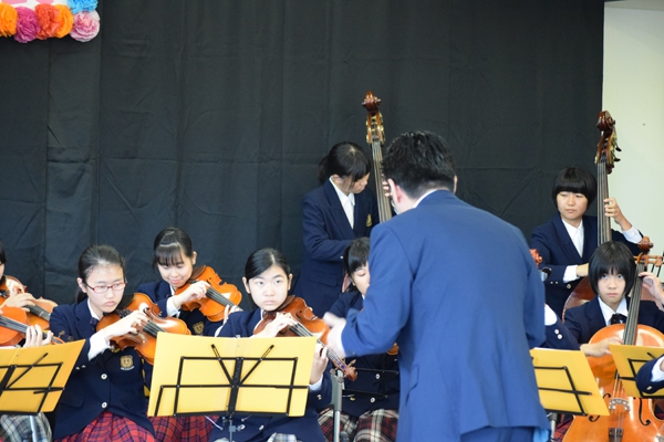高等部生徒会の会長・副会長たち司会進行のもと、コーラス部と管弦楽部が出演しました!アルパークの催しで演奏してきた中で、一番お客様が多い演奏となりました。