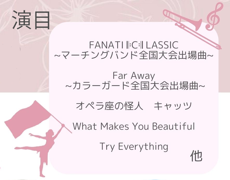 日時: 2024年 3月19日(火) 場所: はつかいち文化ホールウッドワンさくらぴあ アクセス 開演: 17:00~ (開場16:30) 入場料無料です。ご来場お待ちしております!! 主催:山陽女学園中等部高等部マーチングバンド、カラーガード部、保護者後援会、OG会 後援:廿日市市、廿日市市教育委員会、広島県マーチングバンド協会、広島県吹奏楽連盟、日本マーチングバンド協会中国支部