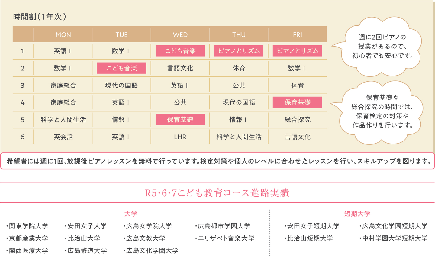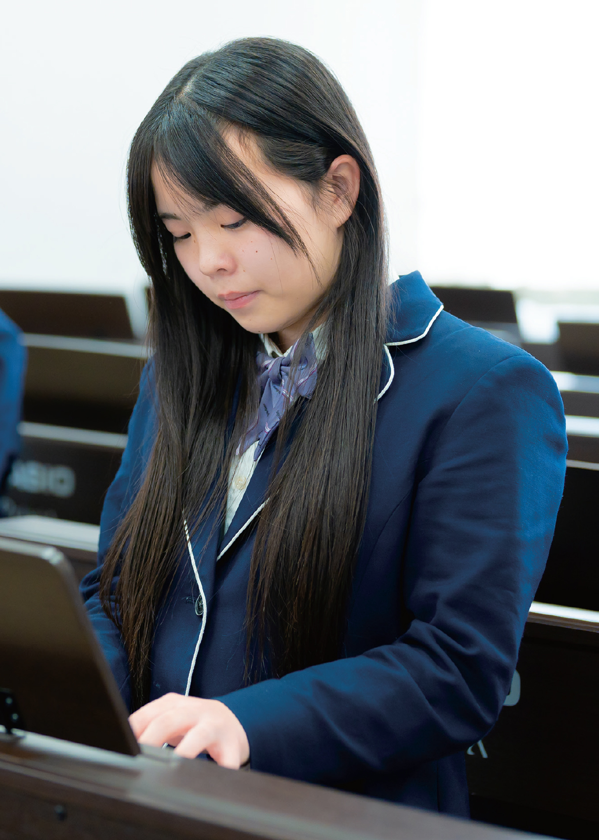 授業ではピアノや図画はもちろん、「こども教育」の基礎を習得し、大学進学を目指します。