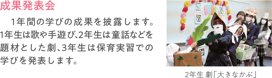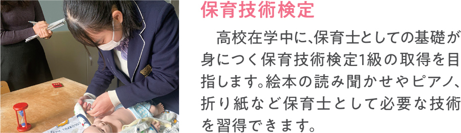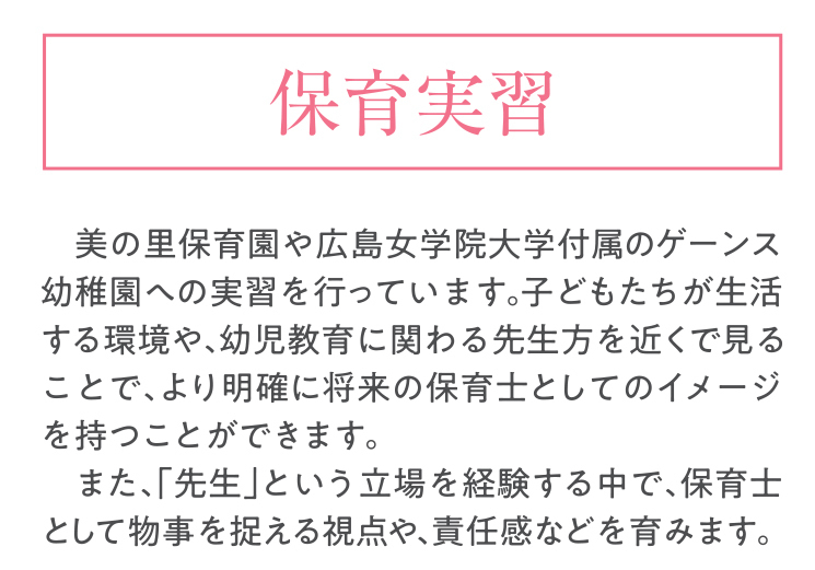 保育士・幼稚園教諭に必要な知識と技術を習得できるコースです。また、3年間で保育実習にも多く参加し、