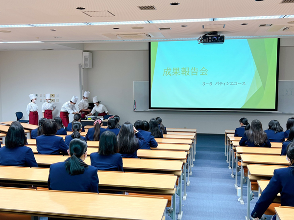 コース説明の中では、「コース在校生Q&A」ということで、中学生の頃にコースを決めたきっかけや学校生活の様子、パティシエコースの魅力を紹介しました。