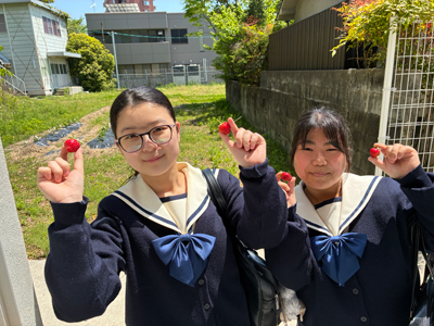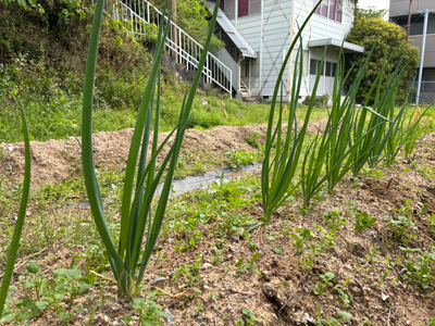 3月に植え付けしたイチゴが少しずつ実をつけ始めました。ネギももうすぐ収穫できそうです。これからが楽しみです。