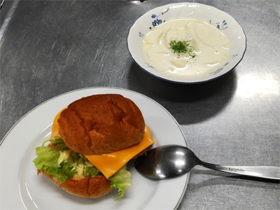 豆腐のおかけでふわふわ食感の「サバーガー」を、炒めて甘くなった玉ねぎ入りの「コーンクリームスープ」とともにおいしくいただきました。