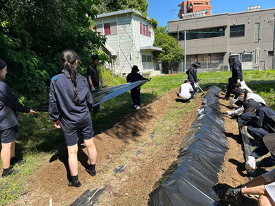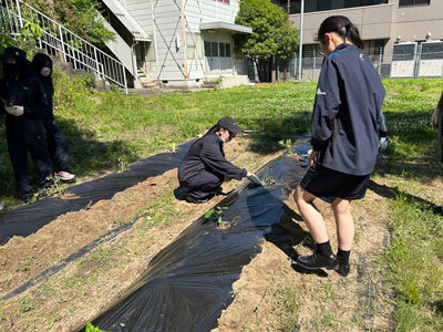 写真は、リアライズサポーターたちが、毎年恒例の畑作業を行っている様子です。みんなで雑草を抜き、土を耕して、苗の植え付けを行いました。暑い中、新たに加わった1年生も、2年生や3年生の先輩たちと共に、一生懸命作業をしていました。今回植えたのは、スイカ、メロン、きゅうり、ミニトマト、ピーマンです。収穫に向けて、元気に育ってくれるといいなと思います。