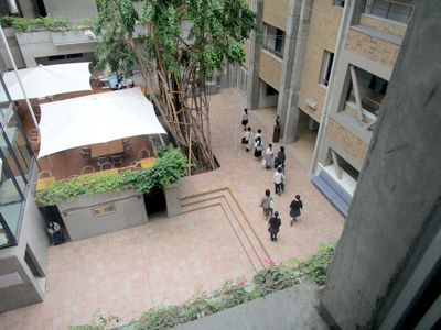 春先には淡いピンク色の花で目を楽しませてくれていましたが、今はポツポツと青い実をつけ始めています。この梅の実たちは、学園敷地内にある系列幼稚園の実習用に使われるとのことですが、実る様子を眺めるだけでも何だかウキウキした気持ちにさせてくれます。折々に四季を感じられる素敵な環境だな、と思います。