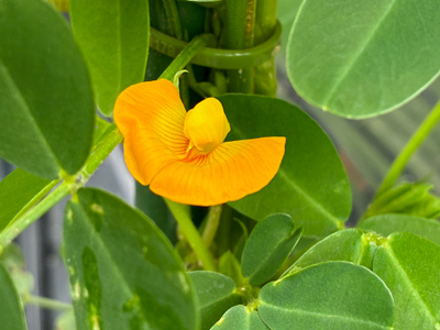 リアライズの校舎裏の畑では、さまざまま作物を育てています。今日は「落花生」の花が咲きました。黄色い、かわいらしい花です。まもなく花はしおれて落ちてしまいますが、花の咲いていた茎の部分が伸びて地中にもぐり、やがて膨らんで実るため、「落花生」と呼ばれるそうです。