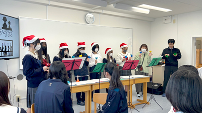 1・2年生で、リアライズサポーター主催のクリスマス会をおこないました。生徒たちによるミュージックベルの演奏や、イントロクイズなどのゲーム、ビンゴなどをおこないました。最後には、生徒一人ひとりが用意したプレゼントを、「きよしこの夜」の演奏に合わせて交換し、とても盛り上がりました。この日のために、一生懸命準備や練習を重ねてきたリアライズサポーターのみなさん、お疲れさまでした。今年最後の活動でしたが、大成功に終わり、とても嬉しく思います。来年もリアサポの活動を通して、いろいろな経験をしていってほしいと思います。