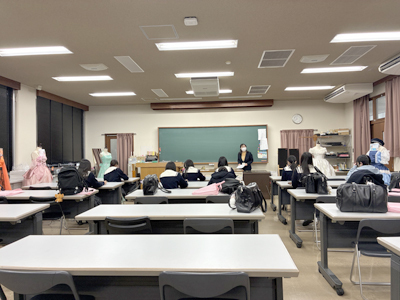 山陽女子短期大学の教室で、人間生活学科の先生による「コミュニケーション心理学」の講義を受けました。自分を客観的にみることや、人によって価値観は違うことなどを体験できるワークを通し、新しい世界が広がりました。