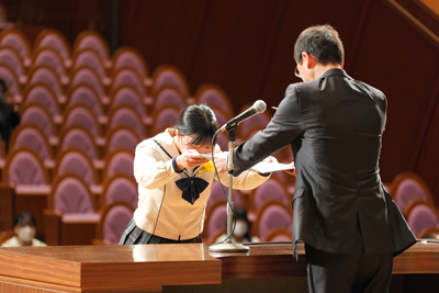 今年は、はつかいち文化ホールウッドワンさくらぴあ大ホールをお借りしての開催となりました。ついこの前、初々しい表情で入学してきた皆さんを迎えたばかりのように感じますが、3年間は本当にあっという間でした。これからまた次のステージへ進んで行く皆さんが、たくさんの笑顔で過ごせますよう、心よりお祈りいたします。卒業、おめでとうございます。