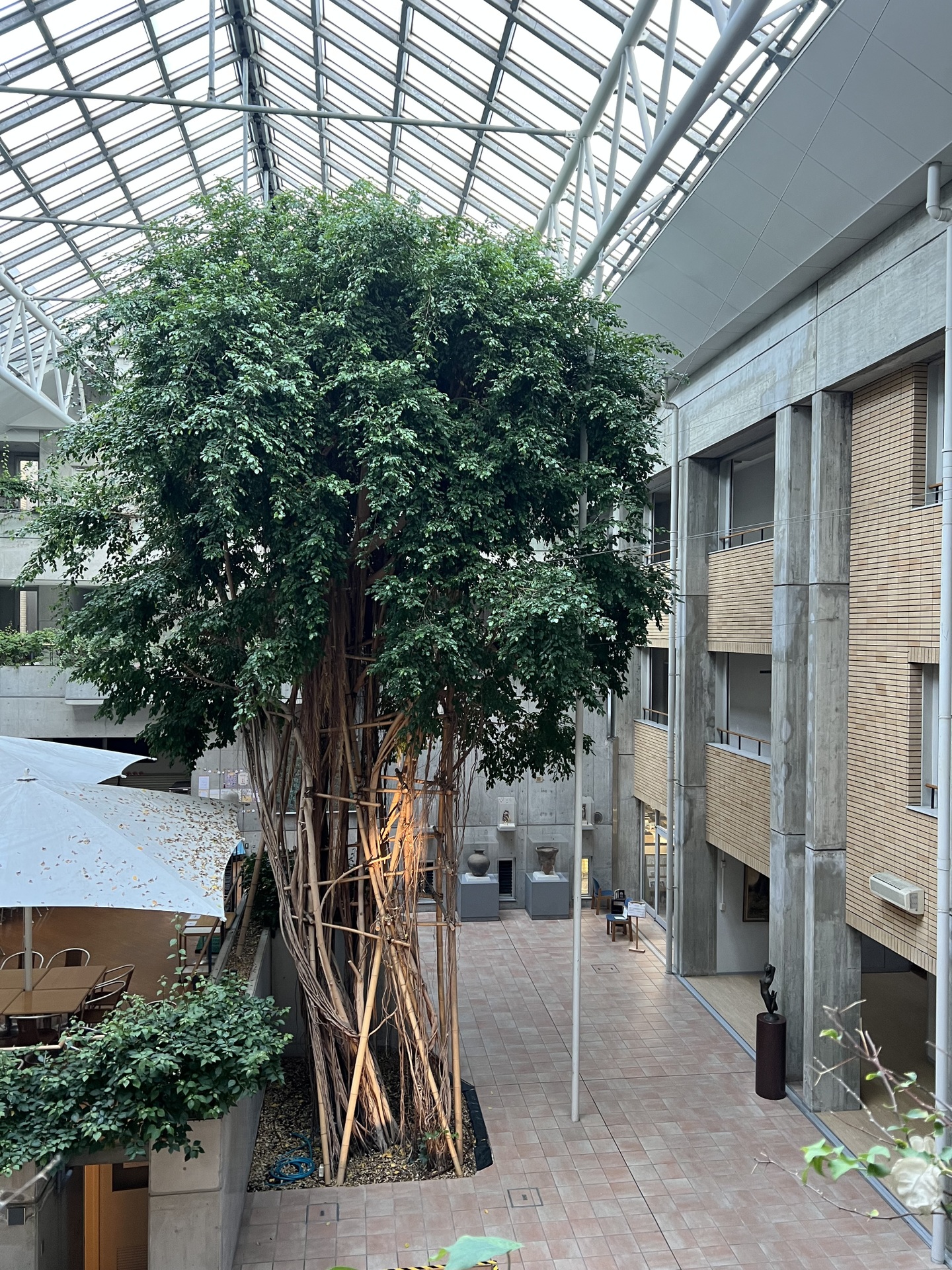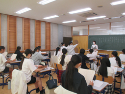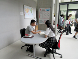 職員室前にあるスペースでよく見かける光景です。白い丸みを帯びた机に座り心地のよい椅子。放課後の自習にもよく使われています。写真はお昼休みの一コマです。受験を控えた高3生が熱心に英語の質問をしています。職員室でもない、教室でもない、図書館でもない、そんな空間が生徒にとってかえって居心地がいいのかもしれません。