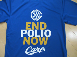 インターアクト同好会はボランティアを中心にいろいろな活動をしています。先日はマツダスタジアムでポリオ撲滅のための募金活動に参加して、活動後に野球観戦もさせていただく予定でしたが、残念ながら雨で中止になってしまいました。当日の活動時に着る予定だったコラボTシャツを記念にいただきました。