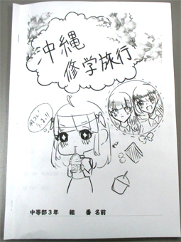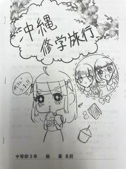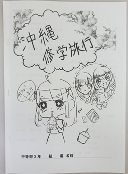 本日から中等部3年生は沖縄研修旅行を行います。あいにくの雨模様でしたが、生徒たちはみな元気よく出発しました。写真は生徒が表紙絵を描いたしおりです。絵だけではなく、事前学習のページも気合いが入っていて、研修旅行を楽しみにしながら作成したのが伝わってきます。沖縄の歴史や自然をしっかり見て、学んで、有意義な研修旅行にしてほしいと思います。