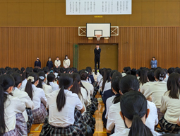 全校集会を体育館で行いました。5月から新任の先生が自己紹介を兼ねてお話をしています。今日は、努力の大切さと授業の受け方についてのお話でした。教員からの問いかけや身近な話題に、生徒達が熱心に耳を傾けている様子が印象的でした。