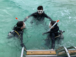 2学年の一大イベントといえば、修学旅行。本校では複数のコースから行きたいところを選びます。今は、沖縄コースを選択した生徒たちが、現地でダイビングのライセンスを取ろうと奮闘中です。参加者全員が取得できることを祈っています!