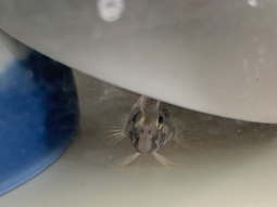 長いまつげで目がパッチリのイソギンポ、警戒心が強く最初は人の気配で隠れていましたが、最近は「人が近づいてくると餌(えさ)が降ってくる~」と認識したようで、顔を出してくれるようになりました。今日も住み処の蒸発皿から顔をのぞかせ、愛らしい瞳で見つめ返してくれました。