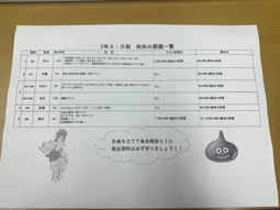本日は、テスト返しと、前期終了式が行われました。いよいよ、秋休みが始まります。秋休みもしっかりと勉強してほしいので、各教科の先生から「秋休み課題」が出ています。前期は今日で終わりましたが、後期からの飛躍のため、また今から学習してほしいと思います。