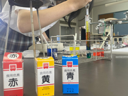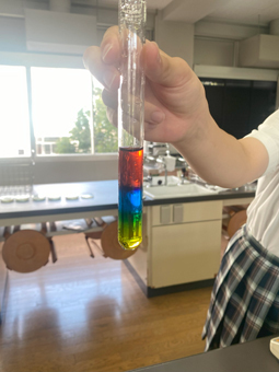 本日から秋休みが始まりました。サイエンス同好会では、文化祭に向けての準備を着々と進めていました。写真にあるカラフルな色水の層は、試行錯誤を重ね、成功したもののようです。失敗にくじけず、文化祭を盛り上げてほしいと思います。