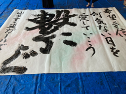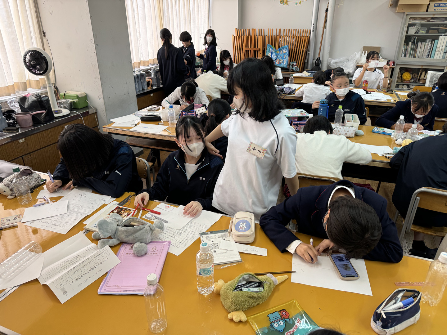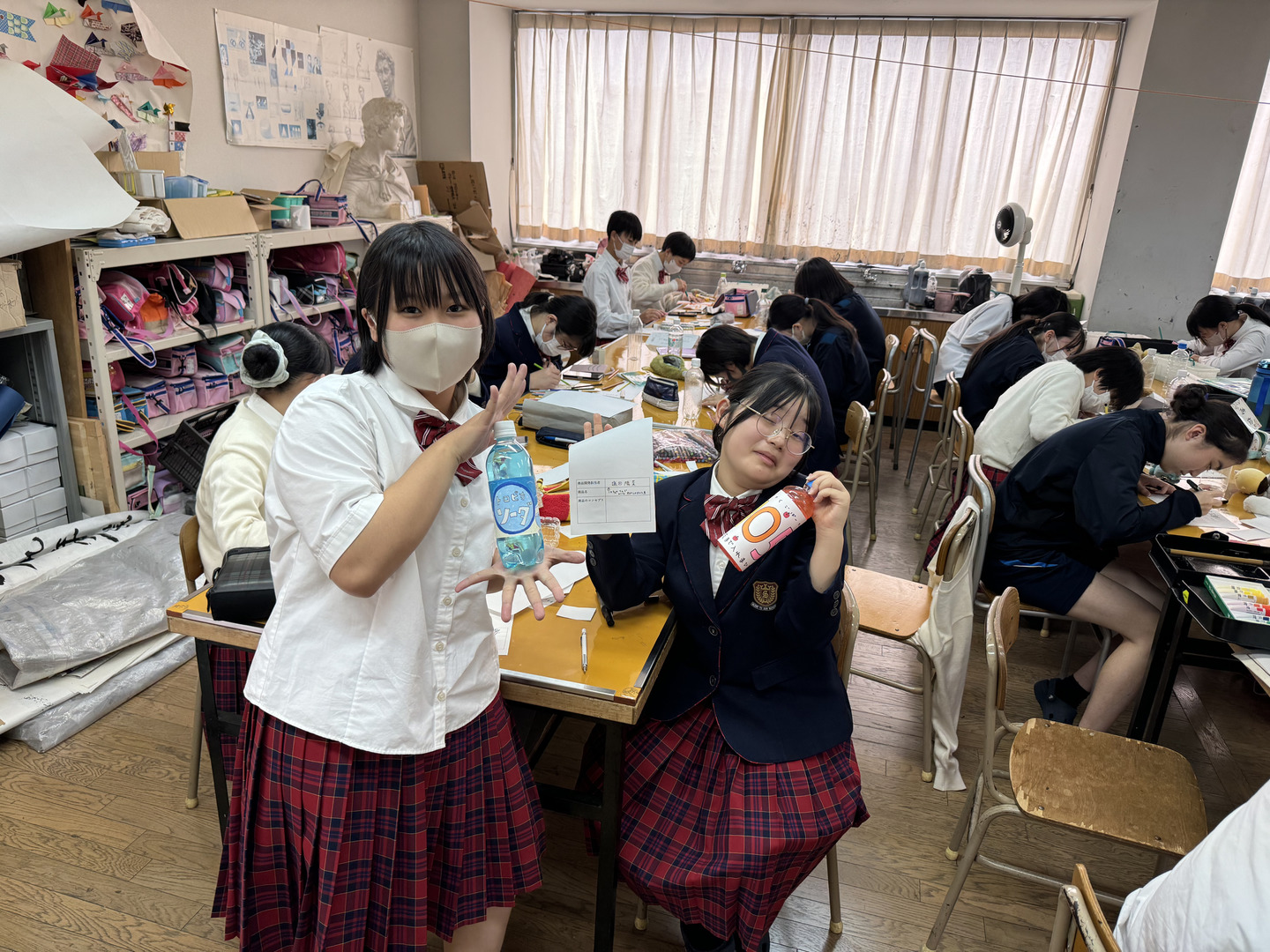 写真は、中等部2年生の書写の時間です。文化祭に展示するための作品を作っています。テーマは「ペットボトルにオリジナルラベルをつ貼ろう」です。カラフルな色彩や個性的なデザインのラベルが展示されるのが楽しみです。