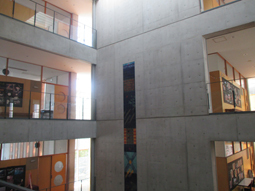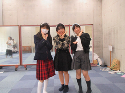 中等部ホールです。こちらでは、いつもミュージカル・演劇部が活動をしています。現在、文化祭での発表に向けて稽古に励んでいます。今日はセリフテスト終了後、主にダンスを練習しました。ダンスの振付は、部員が担当しています。中等部生がカチューシャをおそろいでつけて練習している姿が印象的でした。気合が入っている模様です。