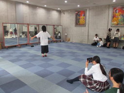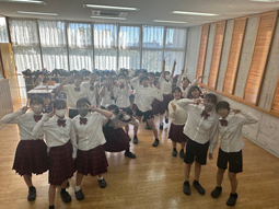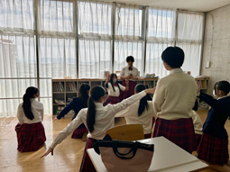 写真は、クラスのみんなで協力しながら、振り付けを確認しあっている様子です。どのようなステージになるのか、とても楽しみです。