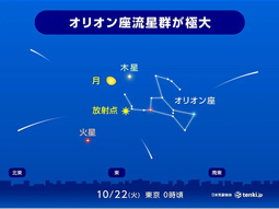 Tenki.jpのHPで調べてみたところ、今晩(21日)~明日(22日)未明が一番の見ごろとのことです。月が明るく、日付が変わるころから曇り予報となっているので少し難しいかもしれませんが、寝る前に東の空を眺めて流れ星を探してみませんか?
