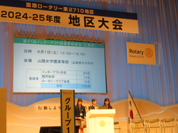 インターアクト同好会は先日岩国で開催された国際ロータリー地区大会に参加しました。当日は1500人を超える出席者の前で、生徒が活動報告について発表しました。とても素晴らしかったとお褒めの言葉をいただきました。大勢の大人の方々に対してプレゼンをする貴重な経験ができたと思います。
