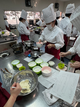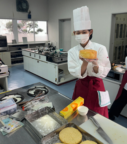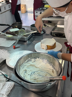 3年6組パティシエコースの授業では、3年間の学びの集大成として、卒業制作に向けたホールケーキの試作に取り組んでいます。生徒たちは試行錯誤を重ねながら、理想のケーキを形にするために工夫を重ねています。どのような作品に仕上がるのか私たち教員も楽しみにしています。