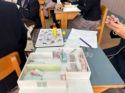 高等部3年生は卒業制作として、理想のマイルームの模型を製作しています。3年間の集大成として、これまで学んだことを踏まえ、プランニングから行いました。最後の授業まであと少しとなりますが、これまでの学習の成果を発揮し、満足できる作品をつくり上げてほしいと思います。