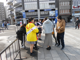 宮島口駅前で街行く人々に募金(赤い羽根共同募金)を呼び掛けました。