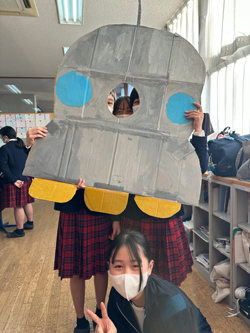 中等部2年生の教室にお邪魔すると個性輝き学習ミュージカルの劇中で使用する生徒が作成したユーホーを見せてくれました。本番ではどの場面で使用するのか楽しみです。