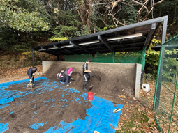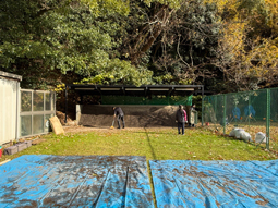 安土とは、弓を射る際に的をかける場所のことです。土を掘り返し、おがくずを混ぜ、土が崩れないようにまた固めていきます。体全体を使うためかなりの重労働になりましたが、完成した後は達成感で満ちあふれていました。きれいになった安土に的をかけるのが楽しみです。