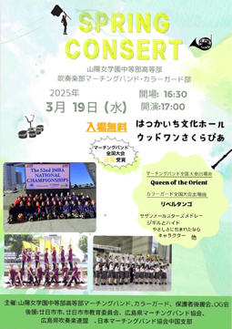 吹奏楽部マーチングバンドとカラーガード部によるスプリングコンサートのチラシが教室に掲示されています。皆さん、ぜひご来場ください!