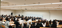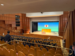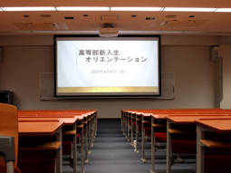 こちらは本館3階にあるベンジャミンホールです。正面には大きなスクリーンがあり、様々な行事で使用します。明日はここで新入生オリエンテーションが行われます。学園内の桜も満開となり、新入生を迎える準備も万端です。