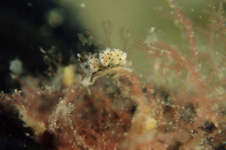 学校のすぐ近くに広島湾が広がっています。広島湾は栄養豊富で、カキの養殖が昔から盛んに行われてきました。近年は護岸整備が進み、私たちは住みやすくなったものの、逆に広島湾の貧栄養化が問題となっています。それに伴ってか、広島湾の海中でもウミウシの生態が少しずつ変わってきています。この時期、ガヤという海藻にちょこんと乗っている小さな小さなマツカサウミウシも貴重な生物になってしまう日が来るのでしょうか?