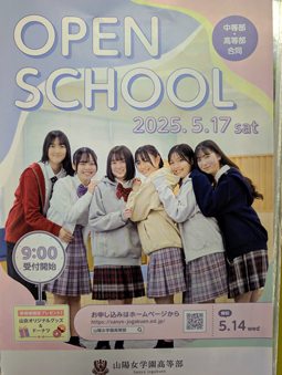 5月17日(土)に第一回オープンスクールが開催されます。制服ファッションショー、コース体験、クラブ体験など魅力いっぱいの内容をご用意しています。中学生のみなさん、是非この機会に山陽女学園にお越しください!