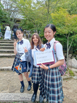 高2特進コースの一部の生徒は、総合的な探究の時間で宮島の企業や寺社との協働活動をさせていただいただいています。写真は宮島の大聖院にて、御朱印書きのお手伝いや外国人観光客へガイドボランティアをしているところです。英語でガイドをする生徒は、語学が堪能で、5ヶ国の言葉に対応できます。このたびはチリから来られた方に、手水などの参拝のマナーから、独自に作成した院内のツアーを企画し、案内しました。「どうして境内のお地蔵様は帽子を着けておられるのか」など思いもよらない質問も出て、彼女たちにも深い学びとなっているようです。