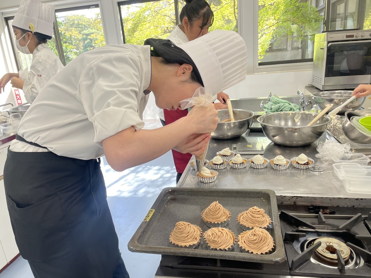1年生のパティシエコースは本日「プロフェッショナル講座」でした。広島酔心調理専門学校の先生を講師に迎え、モンブランに挑戦しました。生徒に聞くと、マロンクリームを絞るのが難しかったそうです。苦労した甲斐あって、とても美味しそうにできました!