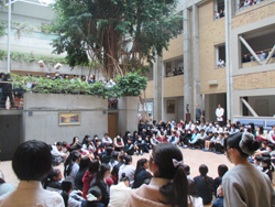 今日はハロウィン!なのですが、本校は文化祭準備日を迎えました。今年初めての試みが、文化祭前の生徒集会をアトリウムで行ったことです。在校生一同が1階アトリウムを中心に2階、3階廊下を囲み、準備中の注意事項などを聞いています。生徒たちの高揚感と意気込みが感じられ、とてもよい開会となりました。このあとは体力勝負の校具移動が待っています。ケガのないように頑張ってください。