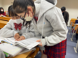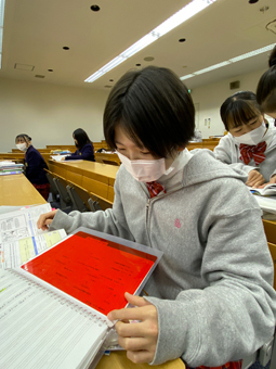 直前には、文法について友だちと確認しあいながら、一生懸命勉強していました。今回はいつもよりも難しかったので、テスト中も苦戦している生徒も多かったです。冬休みを使ってしっかりと復習をし、年明けの模試に向けて頑張ってほしいと思います。