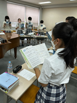 3年生の音楽の授業にお邪魔しました。「花の街」という曲を歌っていました。この曲は、戦争の悲惨さや平和の尊さを歌にしたもので、曲が作られた時代背景などを事前に学ぶことで、歌唱に気持ちが込められると感じました。生徒達にとって身近な「音楽」を通して戦争や平和について理解を深められる有意義な授業でした。