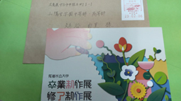 とてもうれしい郵便が届きました。尾道市立大学芸術文化学部美術学科に進学した生徒からの、卒業制作展へのお誘いでした。ホームルームで毎日顔を合わせていた彼女が、この4年間でどんな女性になり、どんな作品で自分の思いを表現しているのでしょう。会いに行ってこようと思います。